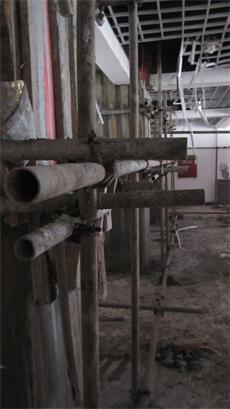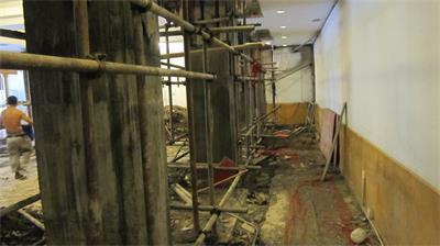 本项目为工行四川省分行营业部综合楼加固维修工程,七层钢筋混凝土框架结构,地点位于成都市如是庵街28号,地处城市商业繁华地带,本综合楼建造于1985年10月,原使用功能为中国工商银行成都市支行行政办公楼,建成后投入行政办公,目前该建筑于2000年左右对室内局部功能把1-3楼改造内部职工就餐工作间,4-7楼为行政办公。于2011年3月业主拟将在该办公楼屋顶增建一层轻钢房屋,并对部分办公室局部进行卫生间改造,工行委托四川省建筑科学研究院对该房屋进行装修改造前的安全鉴定检测,经现场鉴定检测后需要对局部梁、柱进行加固处理,待加固处理完后均可进行后续装修功能改造。 附我加固单位现场施工改造照片